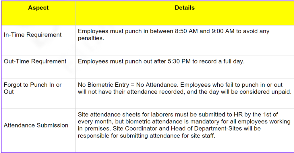 - c) Informing HR or the reporting manager about a missed biometric punch will not be accepted as an alternative.