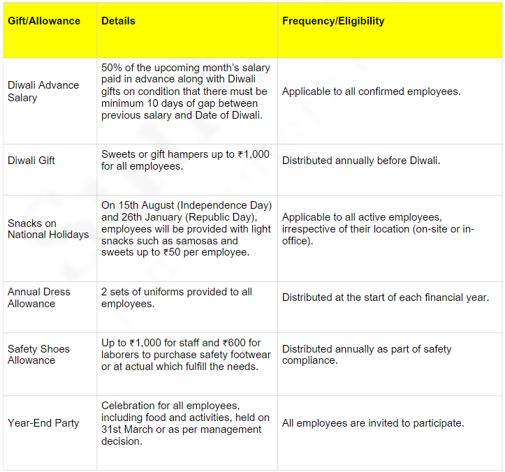 - (a) Diwali Advance Salary and Gifts: Distributed by the last working day before Diwali.