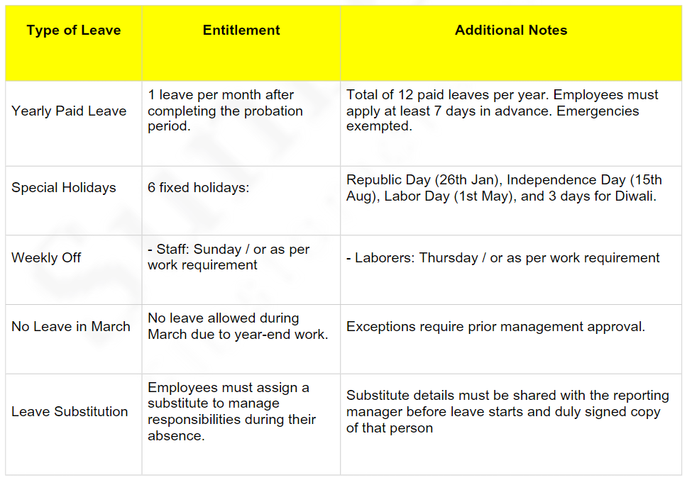 The Yearly Leave Policy ensures employees have a clear framework for availing leaves, promoting work-life balance while maintaining operational efficiency.